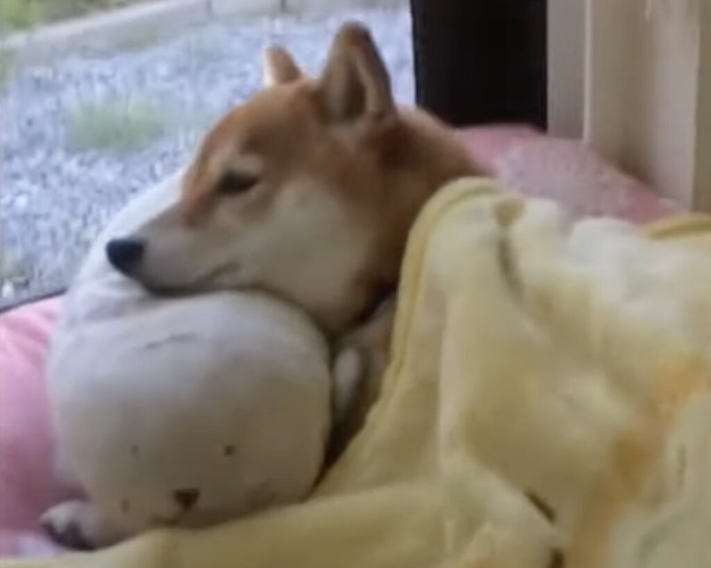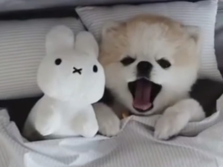 うさぎのぬいぐるみと一緒に、お布団にくるまるポメラニアンさん。 どっちもぬいぐるみに見えるモフモフ感。 ふわぁ〜っと眠そうにあくびをしてウトウト... 手でバンザーイのポーズを取ったまま 眠りについちゃったようです。 それにしてもこの寝顔、可愛...