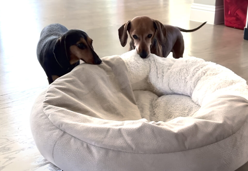 2匹のミニチュアダックスフンドさんが 一緒に使えるくらい大きなベッド!! ふわふわでとても気持ち良くって、 寝心地もよさそうです♪ でも、とっても賢いこの犬さんは もっと寝心地を良くしようと頑張ります。 力を合わせてよいしょ〜っと!! ベッドをぐ... -
