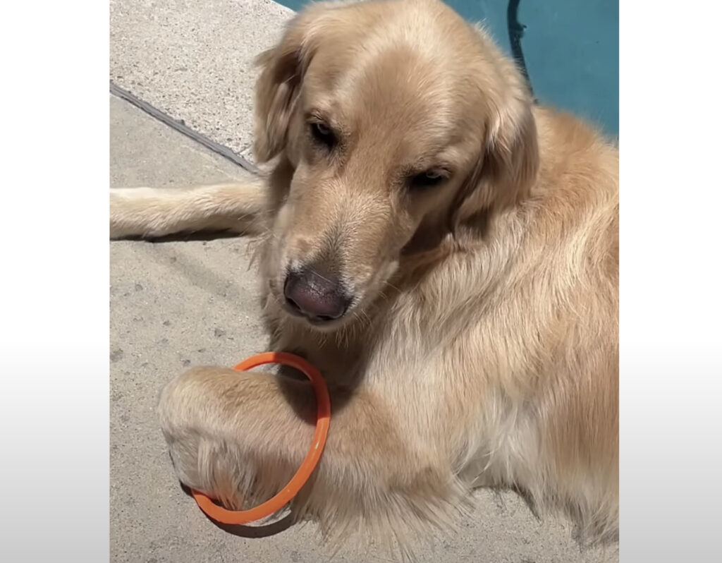 プールサイドでくつろいでいる、 ゴールデンレトリバーさん。 その前脚にはよーく見ると オレンジ色の真っ赤なようなものが。 自分で持ってきたのでしょうか、 誰かに取られるのが嫌なのか、 肌身離さず大事そうに ブレスレットのように前足に装着して ま... -