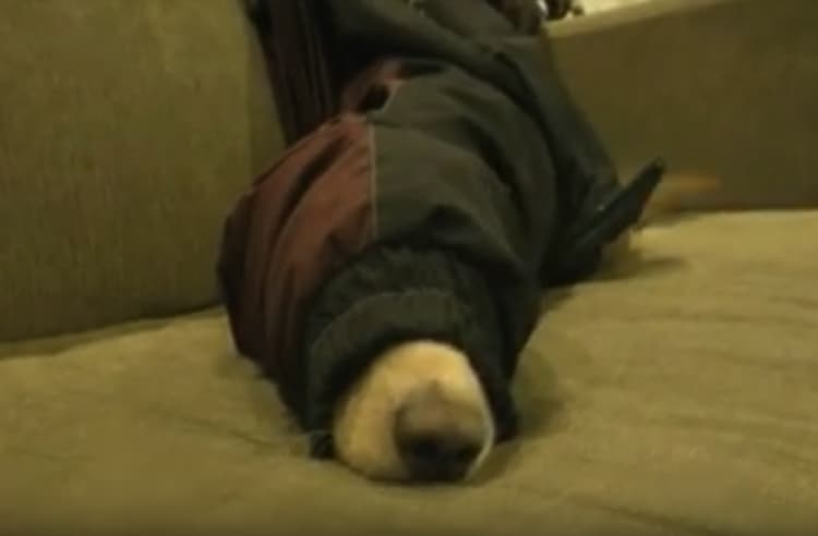 どうしたの?! と言いたくなってしまうような イモムシ状態のワンコさん。 寒かったのか、洋服の袖に入ってしまったよう。 でも、尻尾フリフリごきげん? お茶目で可愛いワンコさんなのでした。