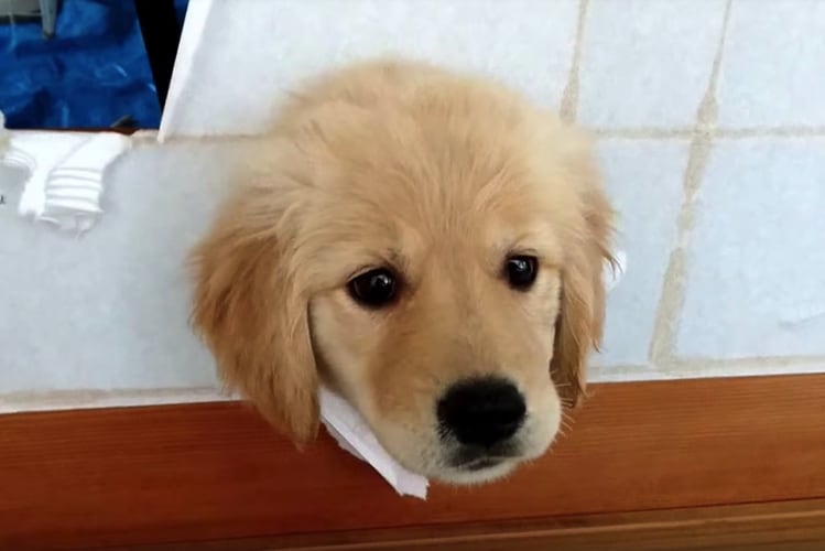 障子にずぼっ!きゅるんとした顔で頭を出している ゴールデンレトリバーの子犬さん。 いたずらはダメだから叱らなくちゃ…と思うけれど こんなの、もう可愛すぎて許しちゃいます!! ゴンッと頭をぶつけちゃうところもおちゃめで癒されます。 -