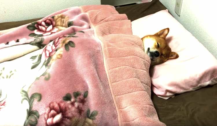 まるで人間?お布団で寝る柴犬が可愛すぎ。