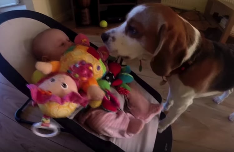 ご、ごめんね!!赤ちゃんを泣かせて大慌てする犬。