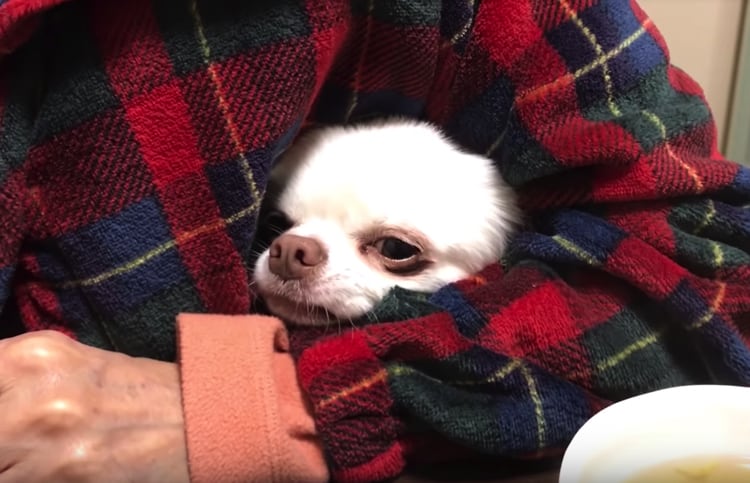 ヘッドロック!ごはんを狙いすぎておばあちゃんに捕まるチワワ。