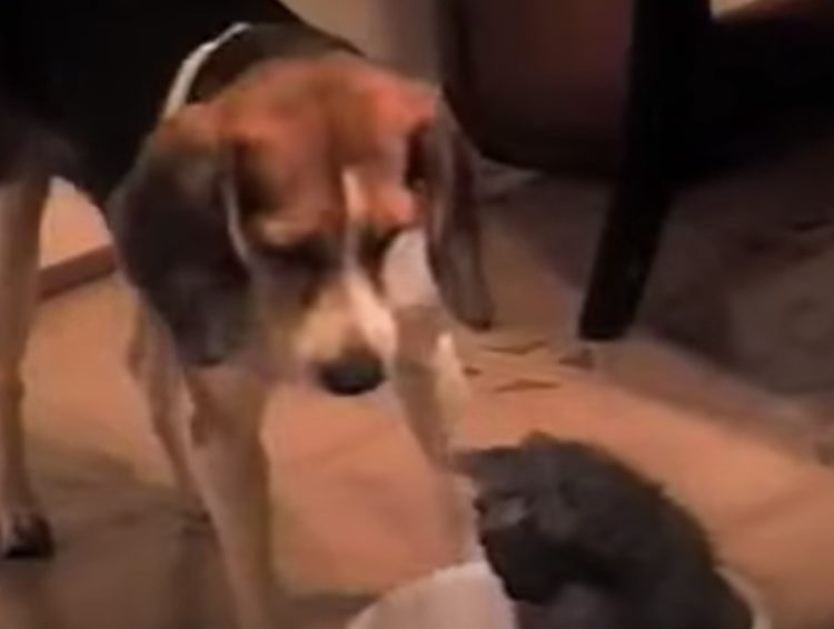 ゴハンの時間だ〜!と ウキウキでエサ皿のところまでやってきた犬さん。 ところが、そこで見たのは エサ皿、の上にすっぽり入っている子猫! え?なんでお皿に入ってゴハンの上に座ってるの? 隙間からなんとかゴハンを食べようとするけど 子猫がいるから... -