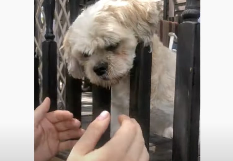 通りを歩いている男性に、 デッキから挨拶をしたくなった犬さん。 柵の隙間からひょっこりと顔を出して 犬「こんにちは!ナデナデして♪」と 可愛らしくご挨拶です。 男性も犬さんに挨拶をして、 頭をナデナデしてあげていましたが... あれ? 戻ろうとして...