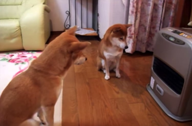 どきどきの2分間!ファンヒーターの点火を待つ柴犬。