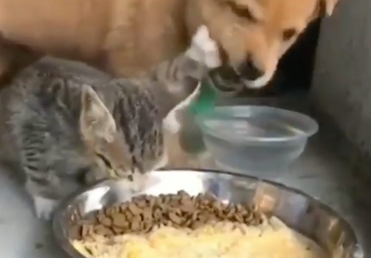 「僕にも食べさせてよぉ…」子猫におあずけされちゃう子犬さん。