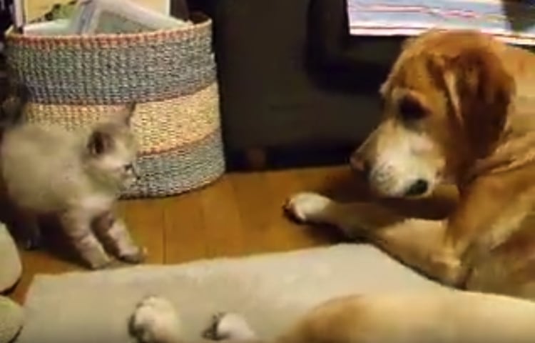 まさかのアタック!子猫の反撃にシュンとしちゃうワンコ。