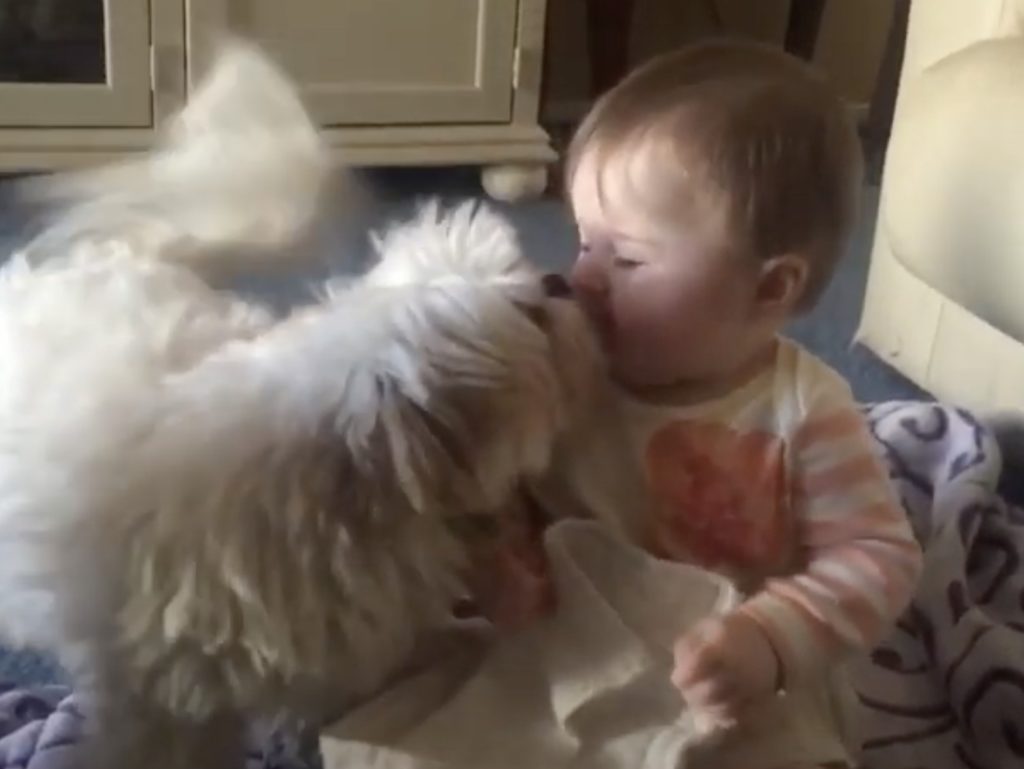 赤ちゃん困惑…ワンコからの熱烈なキス攻撃!