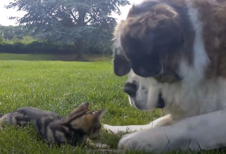 「えっ!こんなに小さいの?」子猫にオロオロする大型犬。