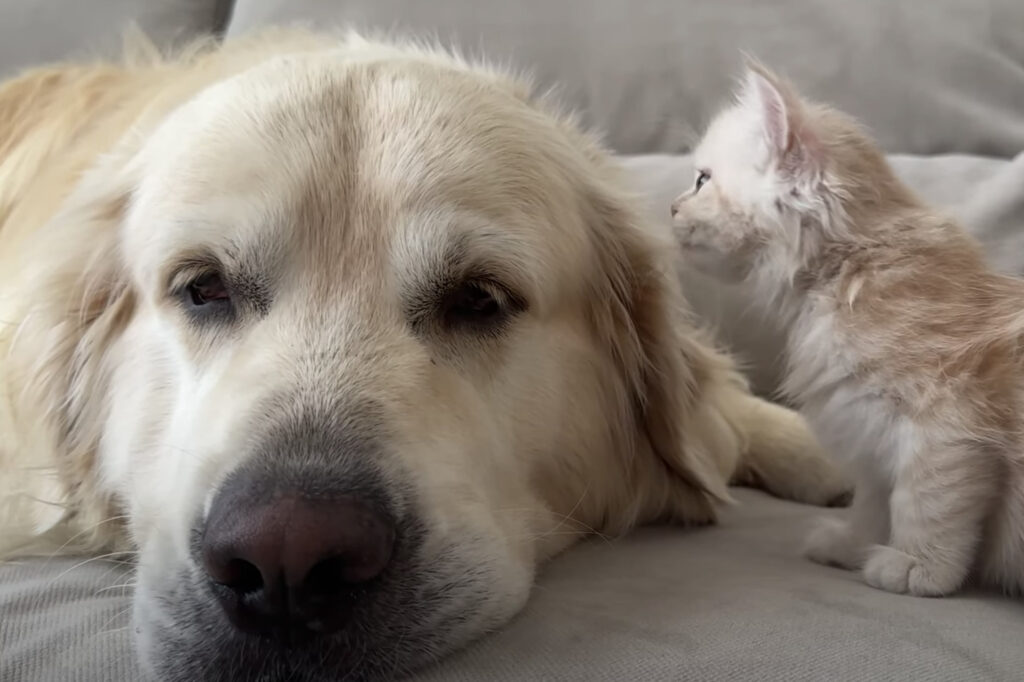 子猫と仲良くなるのが早い! お世話の仕方を心得ている犬さん。