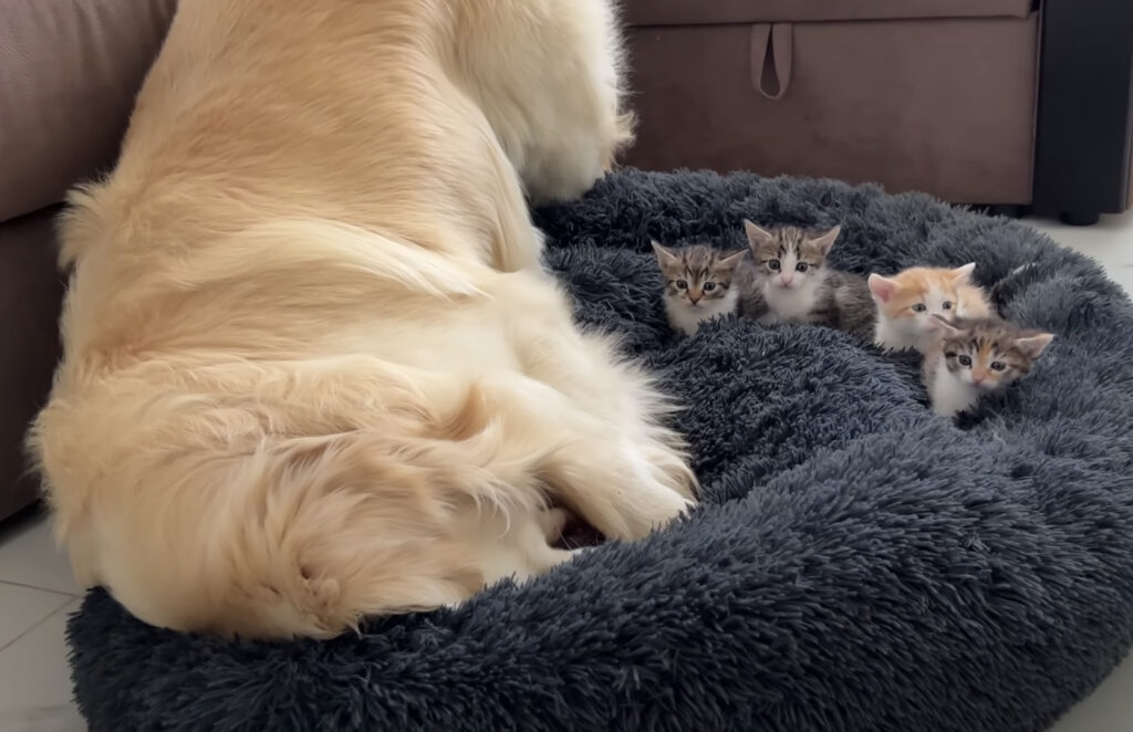ゴールデンレトリバーのベイリーさん。 お気に入りのベッドがあるのですが、 この日はそのベッドの上に、 とっても小さな先客が!! 生まれたばかりのような ちいさな4匹の子猫さんです♪ ベッドを取られてしまったことに ちょっと苛立ちを見せる犬のベイリ... -