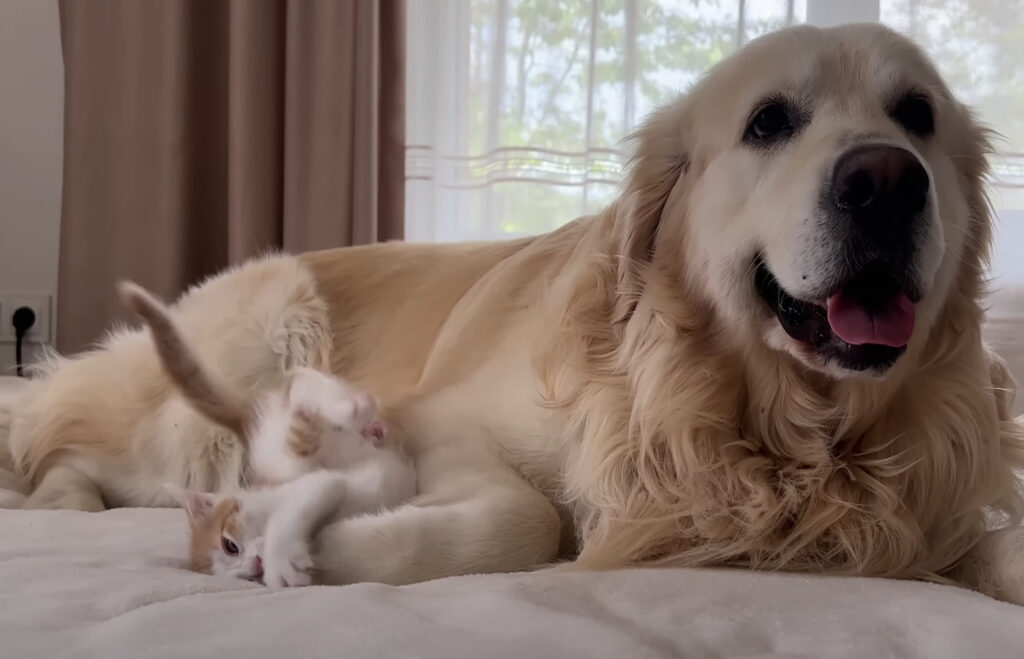 子猫に襲われてるよ〜! まったく動じないおっとり犬さん。