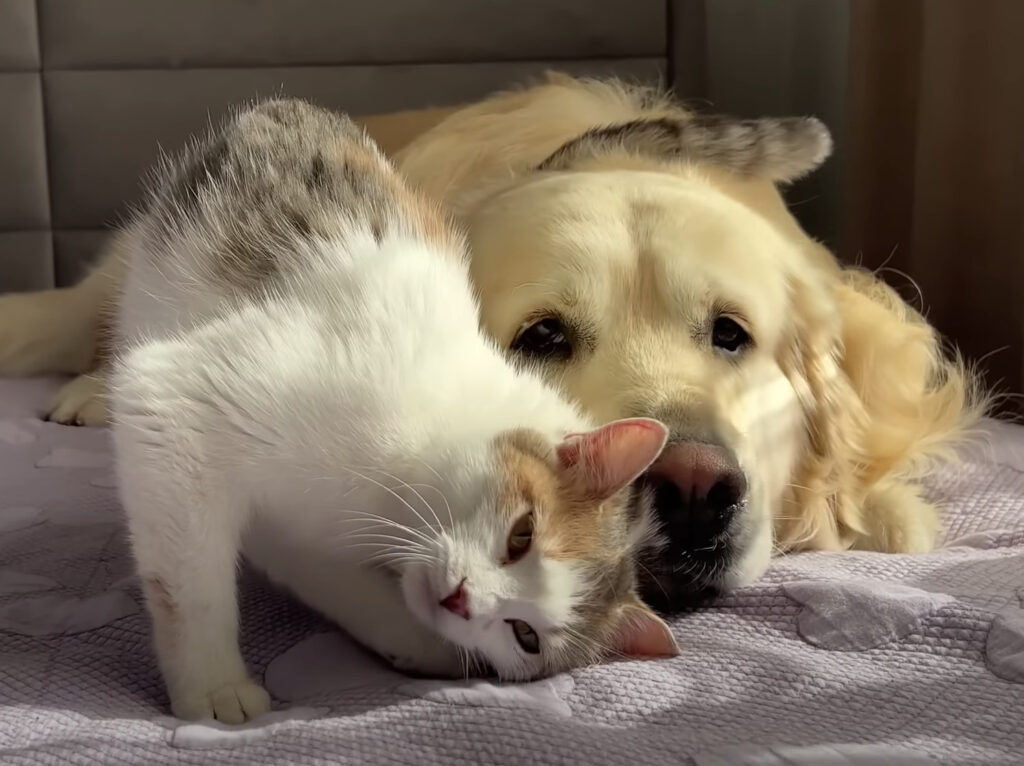 こちらの猫さんは 最近子猫を出産したばかりのママ猫さん。 この日は同居している、 ゴールデンレトリバーさんと子猫達を 初めて対面させる日です♪ 子猫たちはこれまでママ猫とばかり一緒にいたので はじめて見る犬さんの姿にちょっとびっくり!! 犬さん...