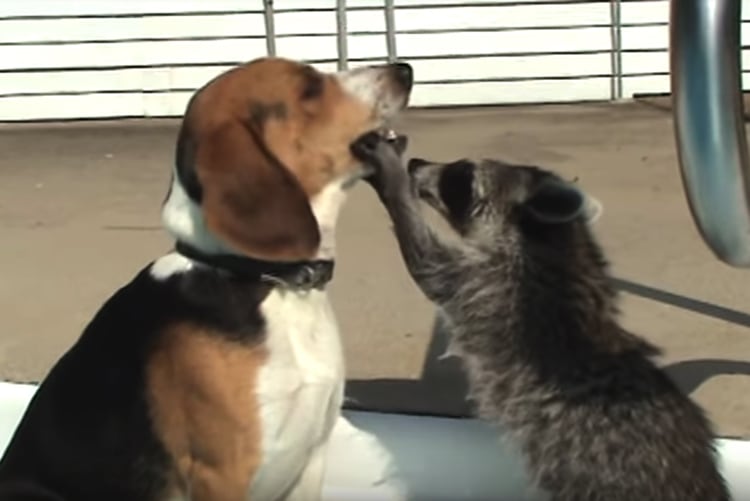 「はい、お口開けて〜」アライグマと歯医者さんごっこするワンコ。
