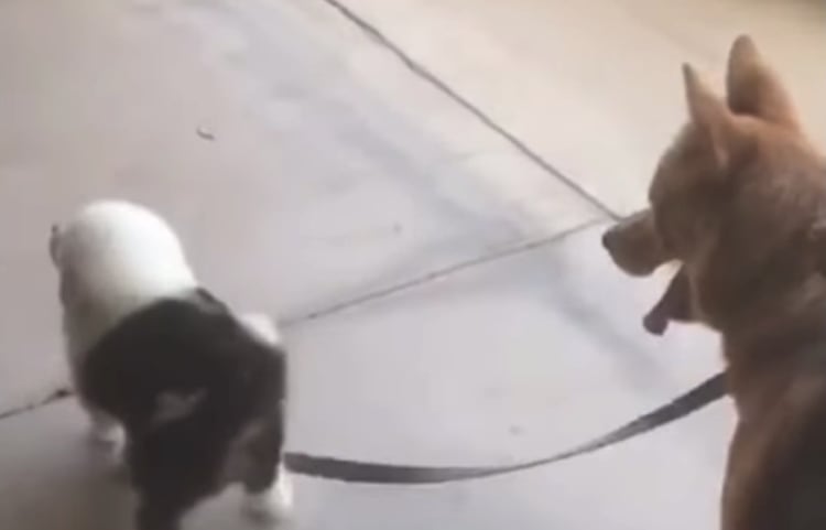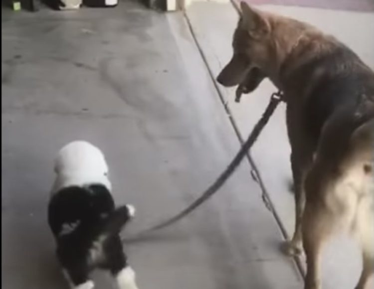 犬同士でお散歩ごっこ?子犬に付き合ってあげる、優しい犬。