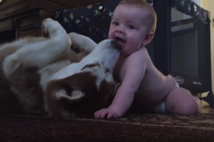 お腹を見せてごろーん!赤ちゃんとイチャイチャするハスキー犬。