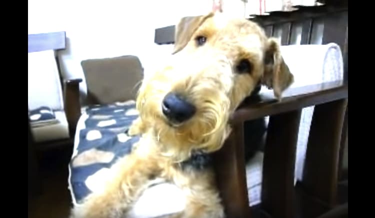 ヒジ掛けにアゴを乗せて、 なにやらぼやくエアデールテリアさん。 クウウ〜ンフウウ〜ン… 甘えたいのかな? 眠たいのかな? 最後には飼い主さんのところへ。 可愛いエアデールテリアさんなのでした。