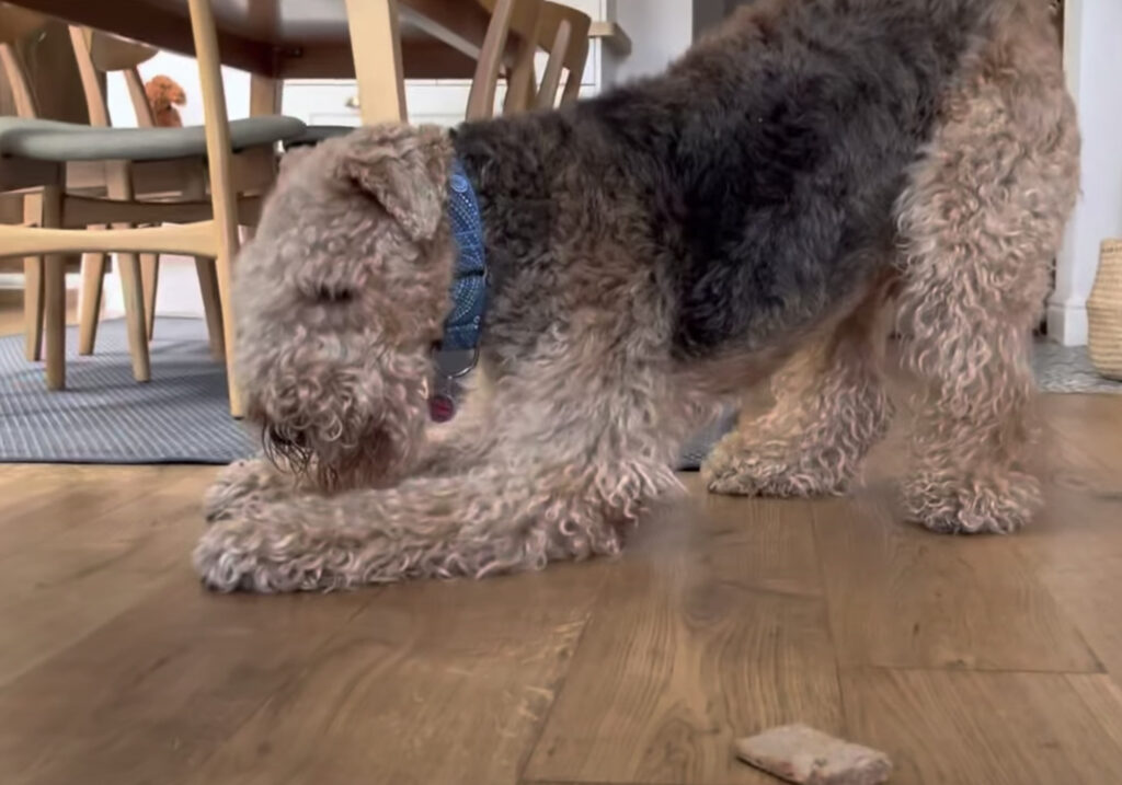 この犬さんは頑固で負けず嫌いだという性格の エアデールテリアという犬種です。 負けず嫌いの犬さん、今回戦っているのは 床に置かれたトースト!! なんの変哲もない、ただのパンです。 なぜかこれがイヤなようで やだやだ!と首を振って、 近づきたくない... -