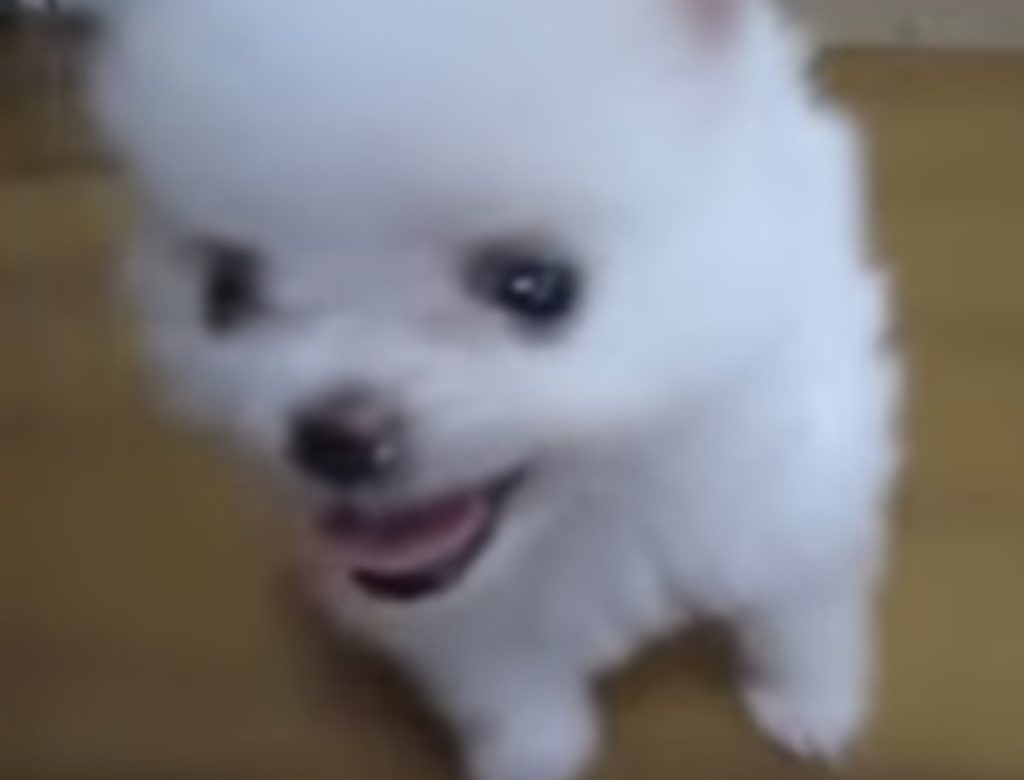 ポメ「見ててね〜小さくなるよっ」大福みたいな真っ白なポメラニアン