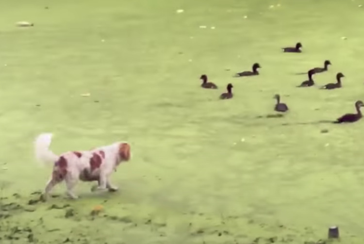 「カモがたくさんいる〜!」群れを追いかけた犬に、予測できないオチが待ってた。