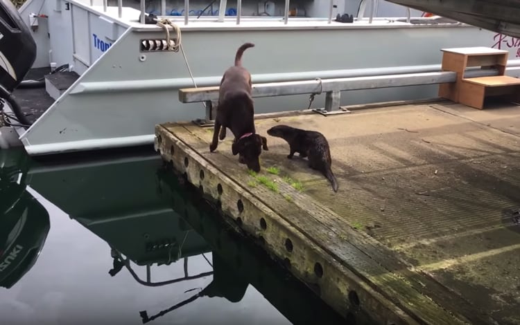 港で遊んでいるラブラドールレトリバーさん なにやら水の中をのぞいてる…? と思ったら、 出てきたのはまさかのカワウソさん! 陸地と水の中をうまく使ってワンコと追いかけっこ 意外にぴったりの友達なのでした。