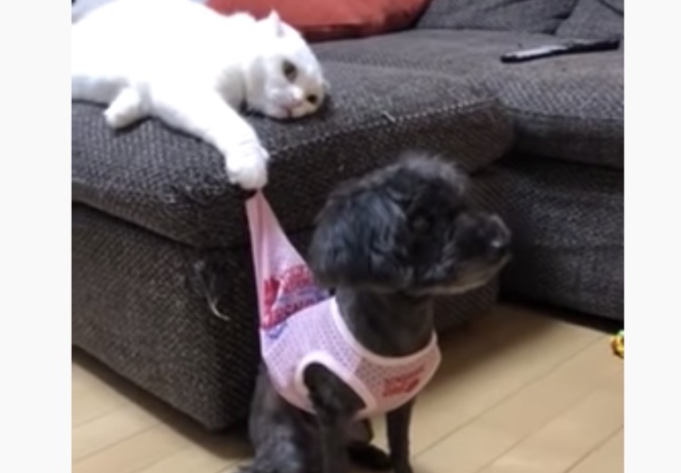 ピンクのお洋服を着た、可愛い黒犬さん。 立ち上がってその場を去ろうとするけれど、 グッと引っ張られるような感覚が... 前進しようとするけれど、 犬「あれ? 前に進めないぞ〜?」 ピンクの洋服がビヨーンと伸びて、 背後の猫さんが洋服を捕まえてる! ... -