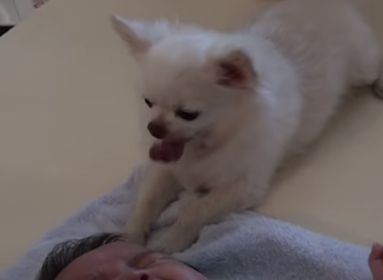 おやつあげるから泣かないで?赤ちゃんに優しい犬さん。