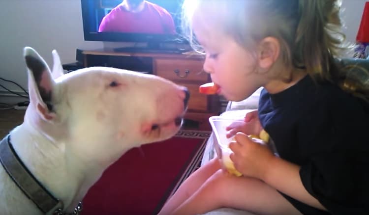 ブルテリアさんと女の子。 タッパーにたくさん入ったリンゴを 一緒に食べようとしているみたい。 リンゴを自分で食べるのか、と思いきや 女の子が口にリンゴをくわえて どうぞ〜っと "ポッキーゲーム?" 犬さんは最初、くわえたリンゴを差し出されても、 ... -