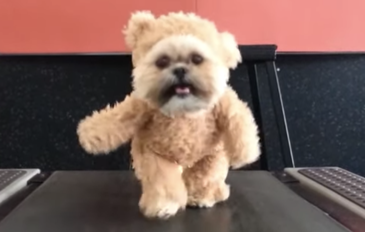 可愛いワンコがカメラに向かって、 トコトコと、ウォーキングマシーンの上を歩いてます。 犬用の着ぐるみをきているのですが、 この子の毛並みとマッチしていて 着ぐるみなんだよね〜と分かっていても まるでテディベアが歩いているみたいに見える! 可愛... -