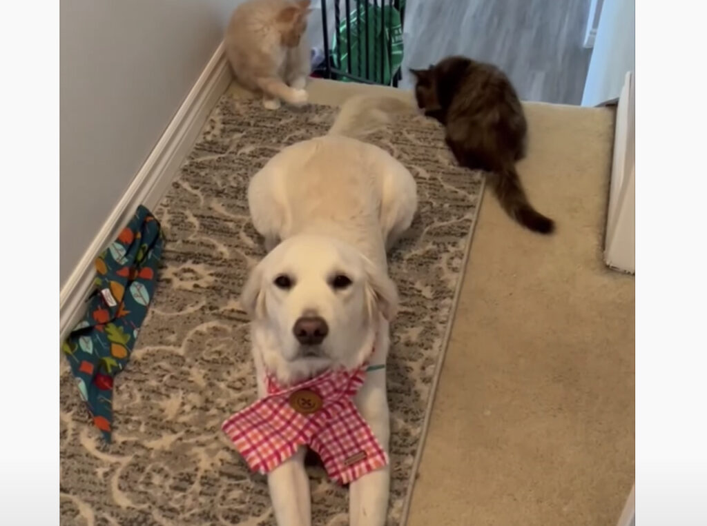 ただ尻尾を振る犬の動画かと思ったら…後ろで子猫が可愛い遊びをしてた♪