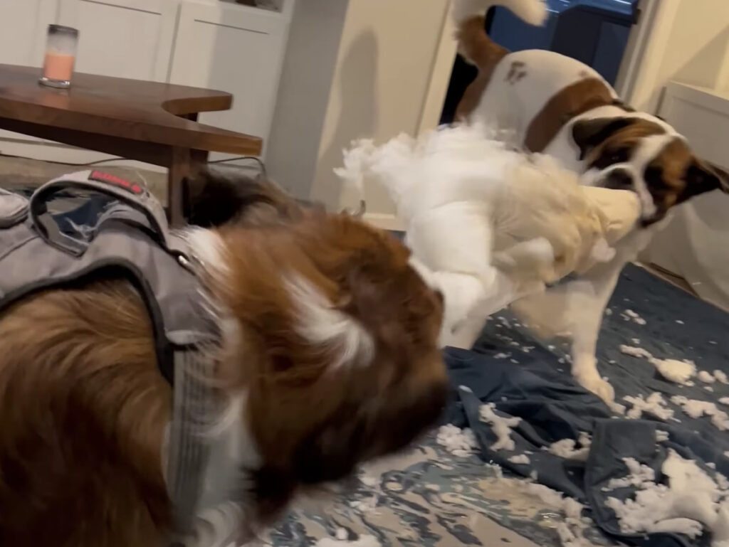 あ〜あ、やっちゃった〜。 セントバーナード、豪快に枕を破壊!