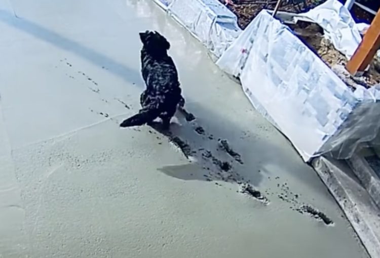 足跡が〜!塗りたてコンクリートの上を元気よく走り回る犬。