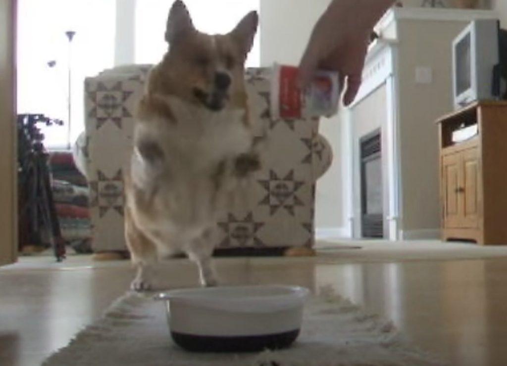 コーギー「ごっはん♪ごっはん♪」食事が楽しみすぎて踊るワンコ。