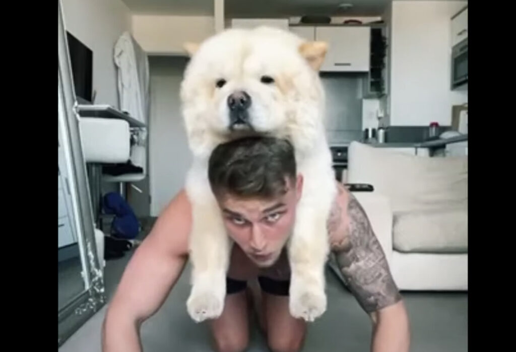 飼い主の背中に乗って、 キョトンとしているもふもふの犬さん。 大型犬のようなので、10kgはありそう! そんな重い愛犬をおんぶしたまま 筋トレを始める飼い主さん! それに合わせて犬さんの体もゆらゆら〜 なんだかよく分からないけれど、 飼い主さんにく... -