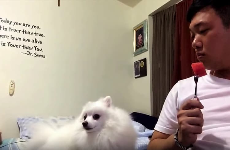 そお〜っ…スイカが気になって仕方ないポメラニアン。