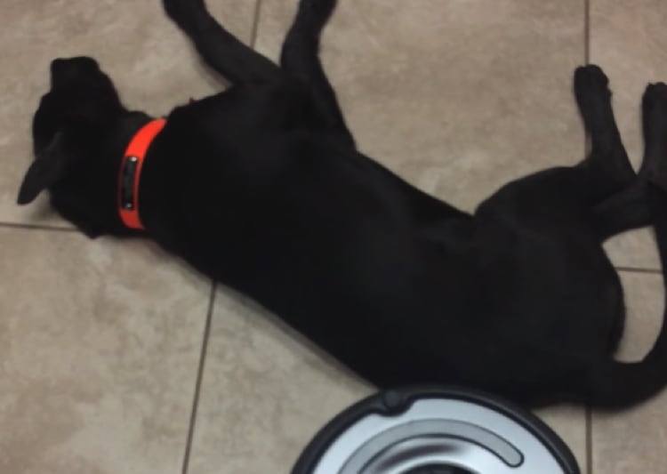 むしろ腰マッサージ?お掃除ロボに攻撃されても動じないワンコ。