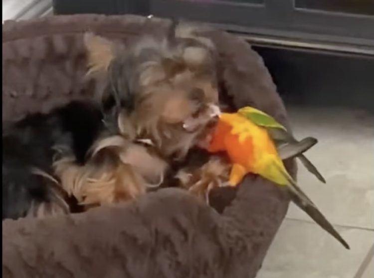 寝かせてってば〜!インコに睡眠妨害されるワンコ。