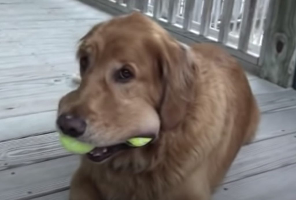 一体どうやって入れているの?テニスボールを口に限界まで頬張る犬さん。