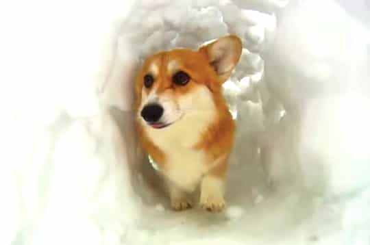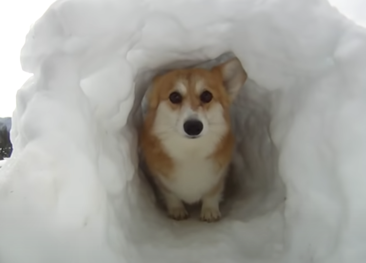 コーギーサイズの雪のトンネルを作ったよ!トコトコ歩く可愛いワンコ。