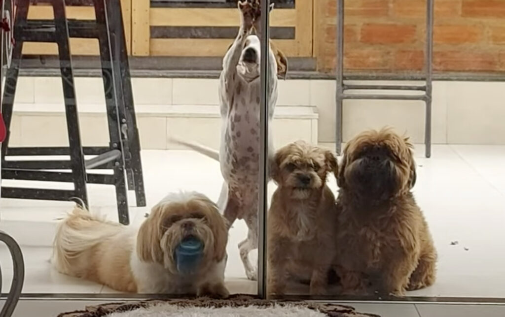 大きなガラスのドアの向こうで 立ち尽くしている犬さんたち。 ドアを開けたいようですが、 重すぎて1匹の力では開けることができません。 しかしこの犬さんたちは諦めてしまうのではなく、 みんなで力を合わせて協力することに! まず鼻の長い犬さんが率先... -