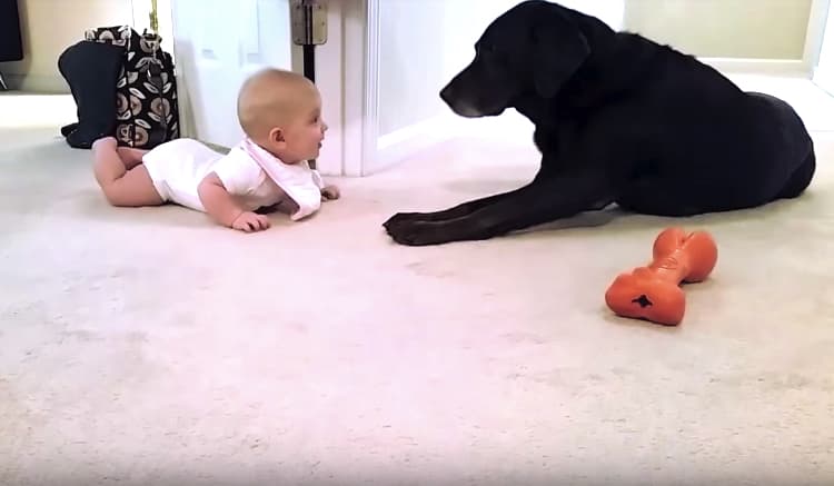 「こっちまでおいで。」赤ちゃんのハイハイを見守る犬。