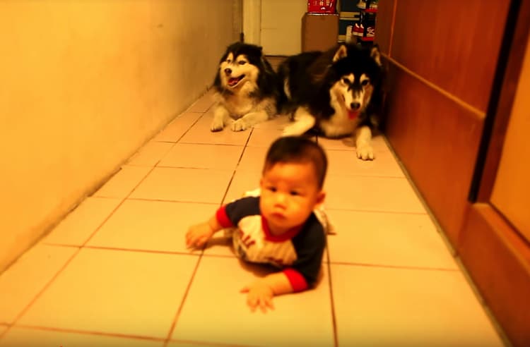 負けないよ!ハスキーと赤ちゃんのハイハイ競争開催。