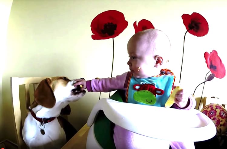 「一緒に大きくなろうね?」愛情あふれる、ベビーシッター犬。