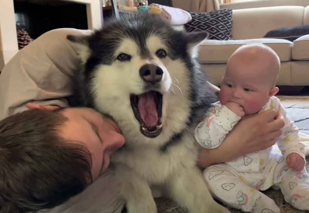 赤ちゃんもいいけど、僕も可愛がって!嫉妬するマラミュートが可愛い。