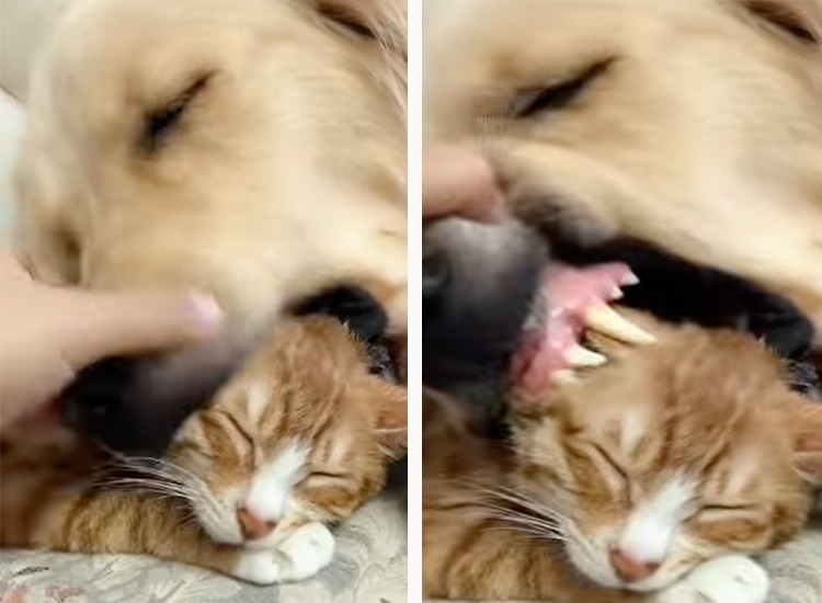 とっても仲良しな犬と猫。 寝る時も一緒にくっついて寝ているのですが その寝姿が衝撃的!! すやすや寝ている猫さんの首を ゴールデンレトリバーさんが 思いっきりぱっくんちょ!! た、食べてる...? 心配になった飼い主さんが、 犬さんの口を開けてみる... -