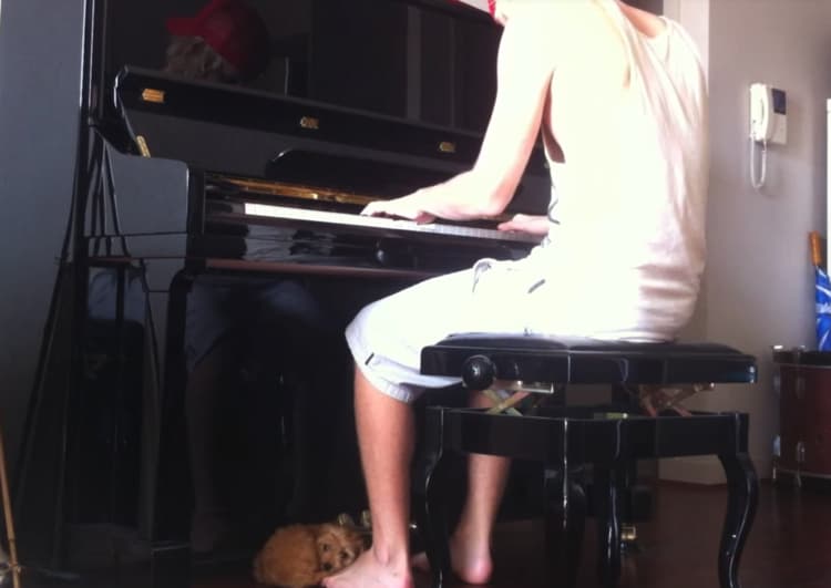 音楽が好きな子犬。ピアノを引こうとするといつも隣に…
