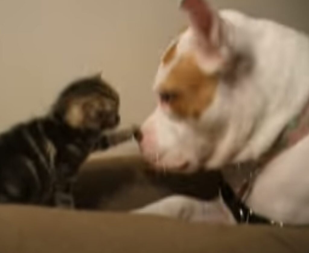 てちてちてち!と寝ているピットブルさんに 構って攻撃をする子猫さん。 だけど怒らず構ってあげています。 鼻をうりうりしてあげたり、 ぺろぺろしてあげたり、 軽くハムッとしてみたり… 遊んで欲しい子猫さんに 手加減しつつ相手をしてくれています。 犬... -