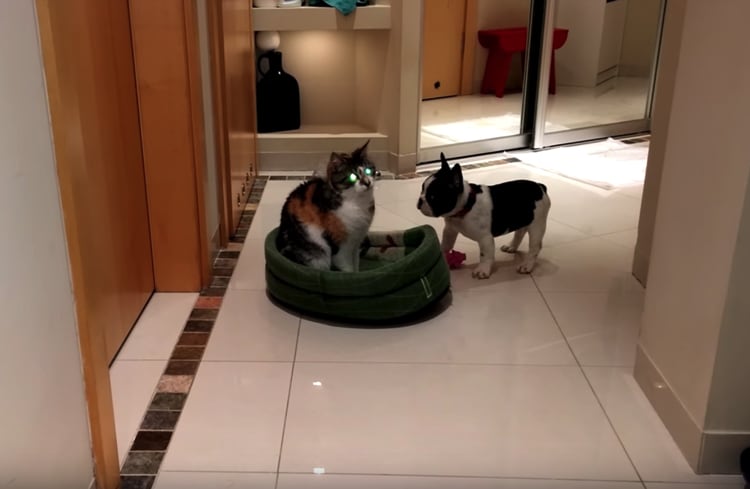 猫さんにベッドを取られてしまったフレブルさん ぐいぐいっと引っ張って、返してよう〜と アピールしますが… 猫さんはキランと目からビーム! ライトが反射しているだけですがなんだか面白い 最後は返してもらえて一件落着なのでした。 -